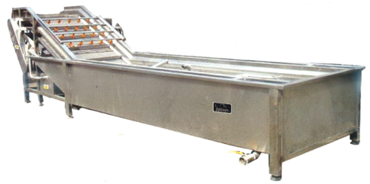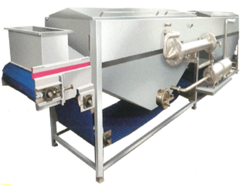 The blanched pea/ vegetable are dropped on to pre-coder conveyor which pre-cools the blanched vegetable when immersed / conveyed through normal temperature water.