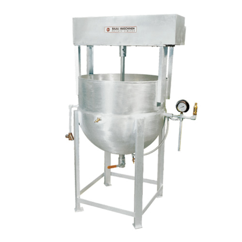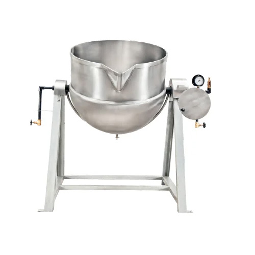 Mounted on a M.S/S.S stand. The kettle has a tilting arrangement through worm gear/pinion which helps to completely empty the contents from it. After cooling by simply turning the wheel.